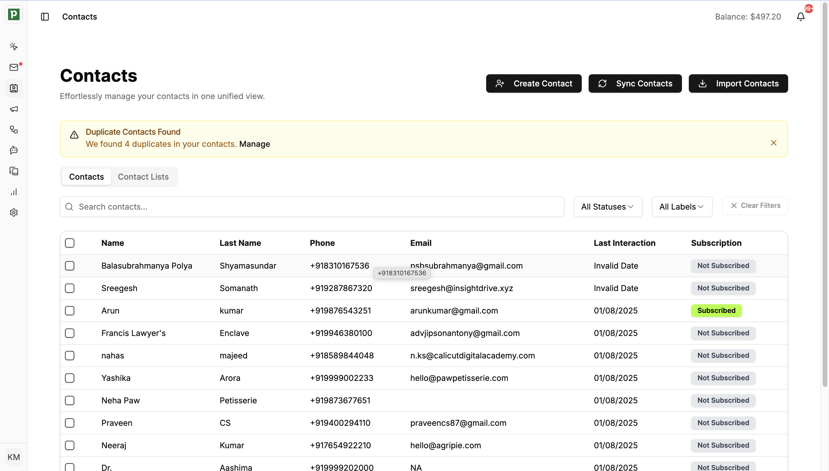 If Mercuri detects contacts with the same phone number or email, they will be flagged as duplicates. You can review these by clicking **Manage** on the Duplicate Contacts banner.