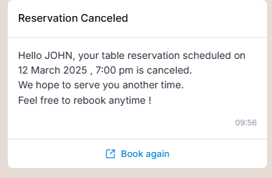 Hello {{1}}, your table reservation scheduled on {{2}} is canceled. We hope to serve you another time. Feel free to rebook anytime!