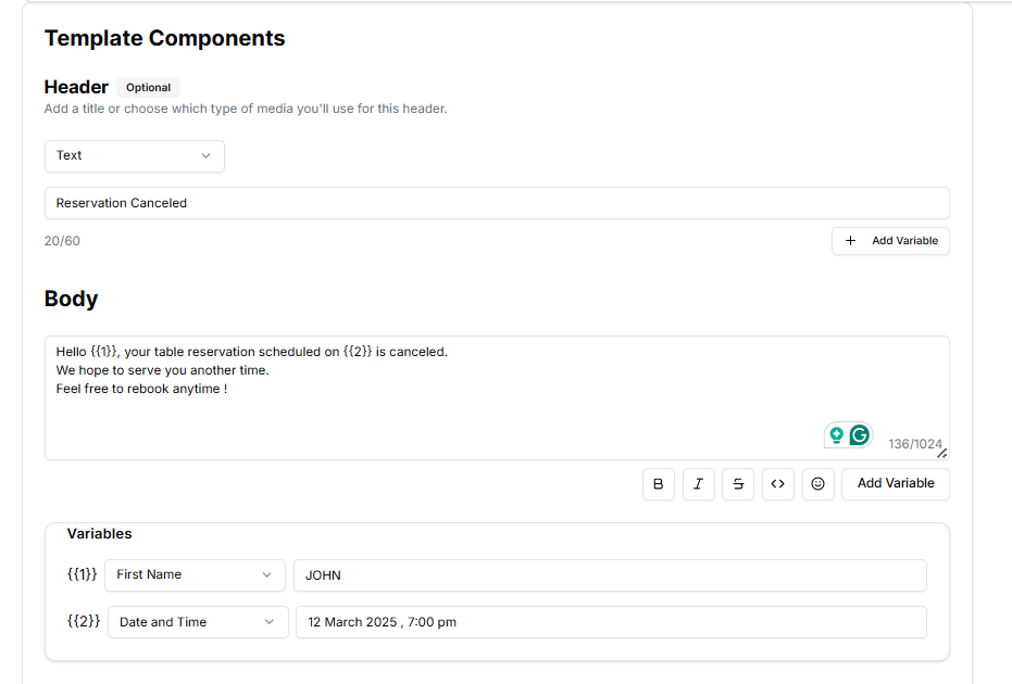 Para incluir informações dinâmicas, como ID do pedido ou nome do cliente, use o botão "Add Variable" no final do campo Body.