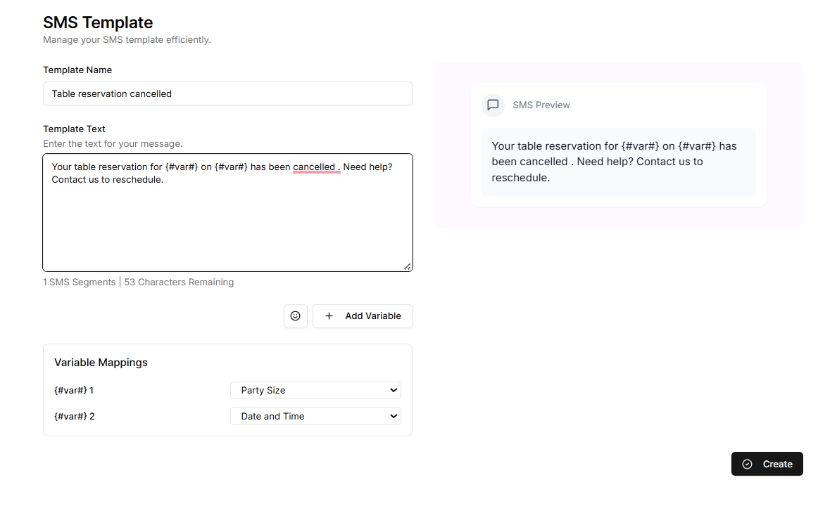 Clique em Create para salvar seu template de SMS. Ele estará disponível para uso em campanhas, automações ou fluxos de trabalho.