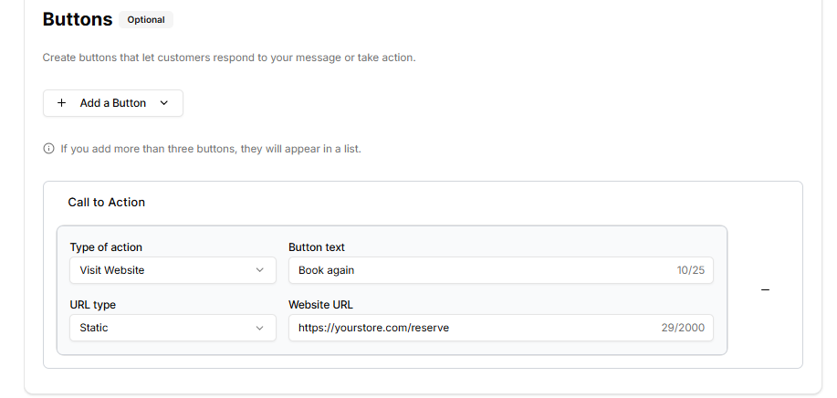 Book AgainSelecione o tipo de URL como Static e insira o link da página de reservas do seu site em Website URL section.
