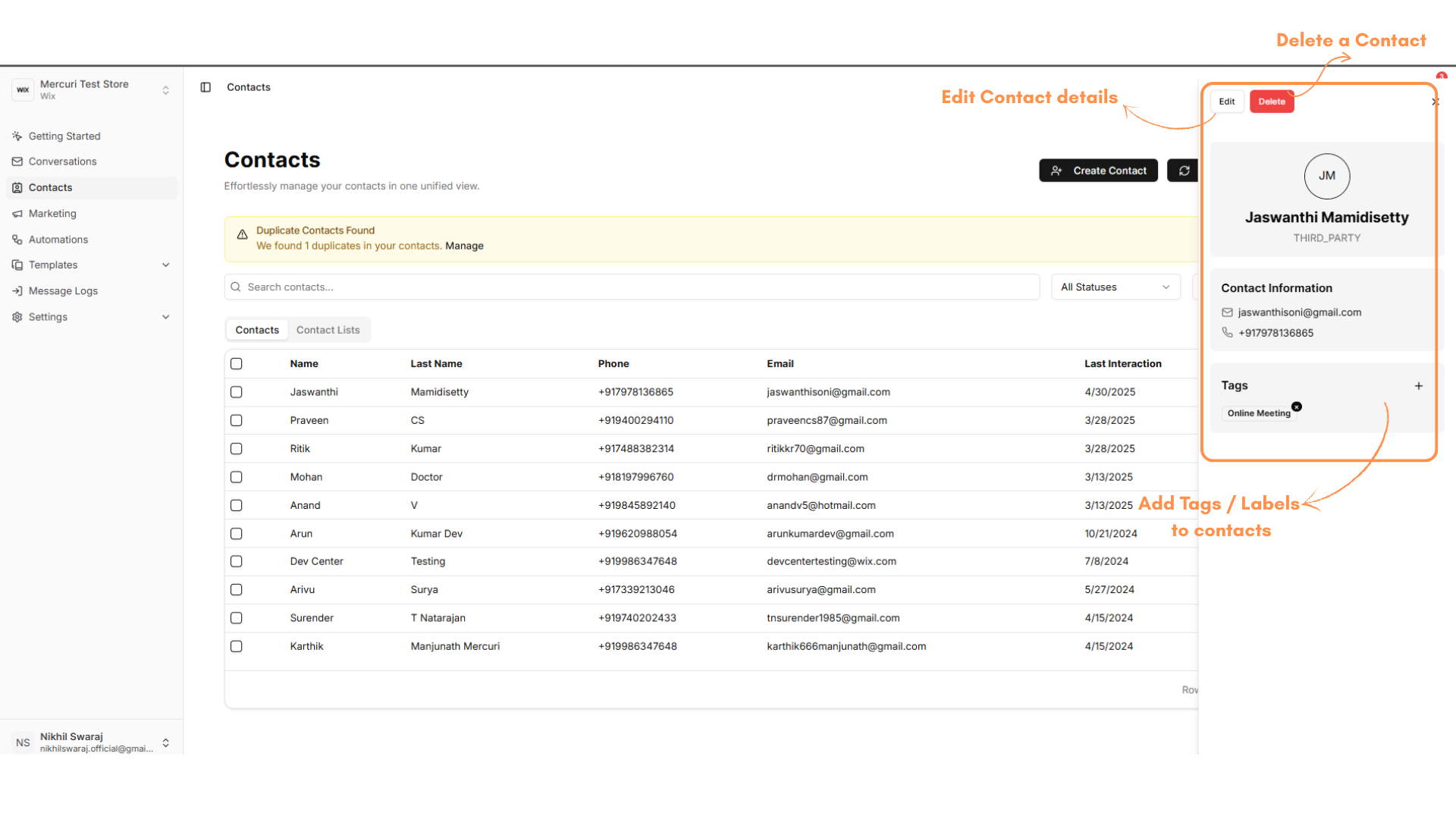 1. Vá para a seção **Contacts** no painel do Mercuri CX e selecione o contato desejado.