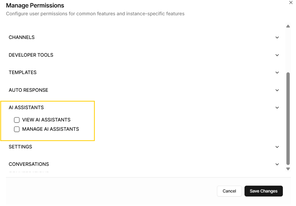6. Em **AI Assistants**, atribua o tipo de permissão desejado — *View* ou *Manage*.