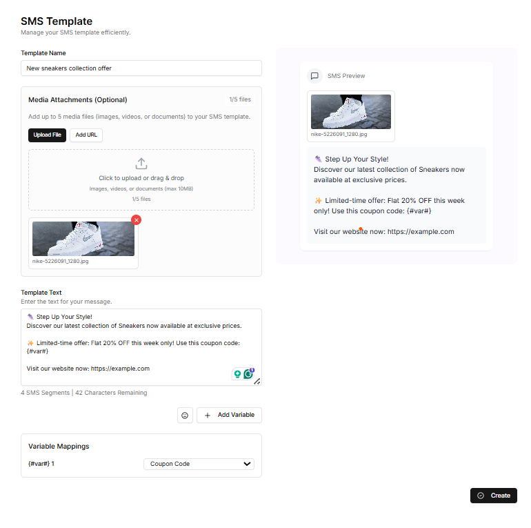 1. Você pode melhorar seu SMS template anexando arquivos de mídia como imagens, vídeos ou documentos.