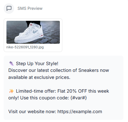 Veja a **SMS Preview** para conferir como a mensagem final aparecerá para os clientes.