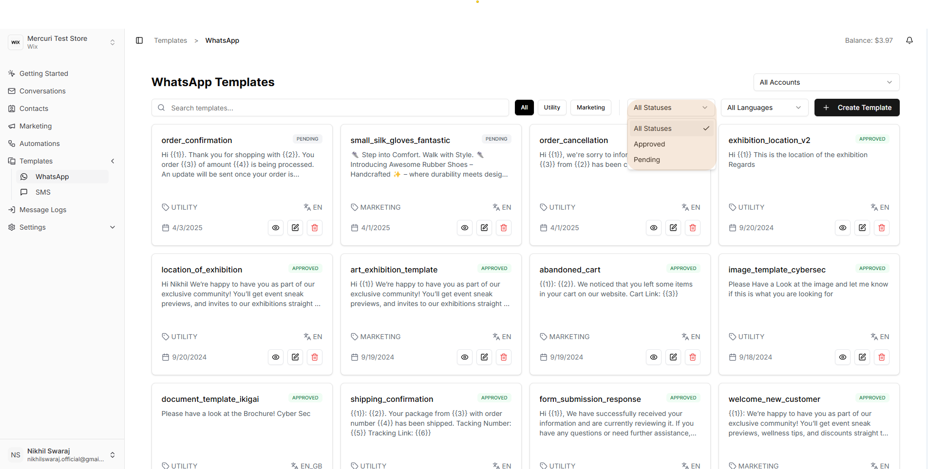 2. Você pode visualizar o status diretamente na lista de templates do WhatsApp ou usar o filtro "***All Statuses***" na seção de templates do WhatsApp para refinar sua pesquisa.