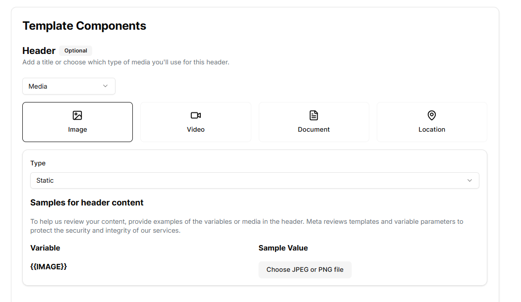 Embora a API do WhatsApp Business suporte mídia dinâmica (imagem, vídeo, documento, localização), plataformas como Wix e Shopify atualmente permitem apenas headers com imagens dinâmicas. Vídeos, documentos e localizações dinâmicas não são suportados nessas plataformas no momento.
