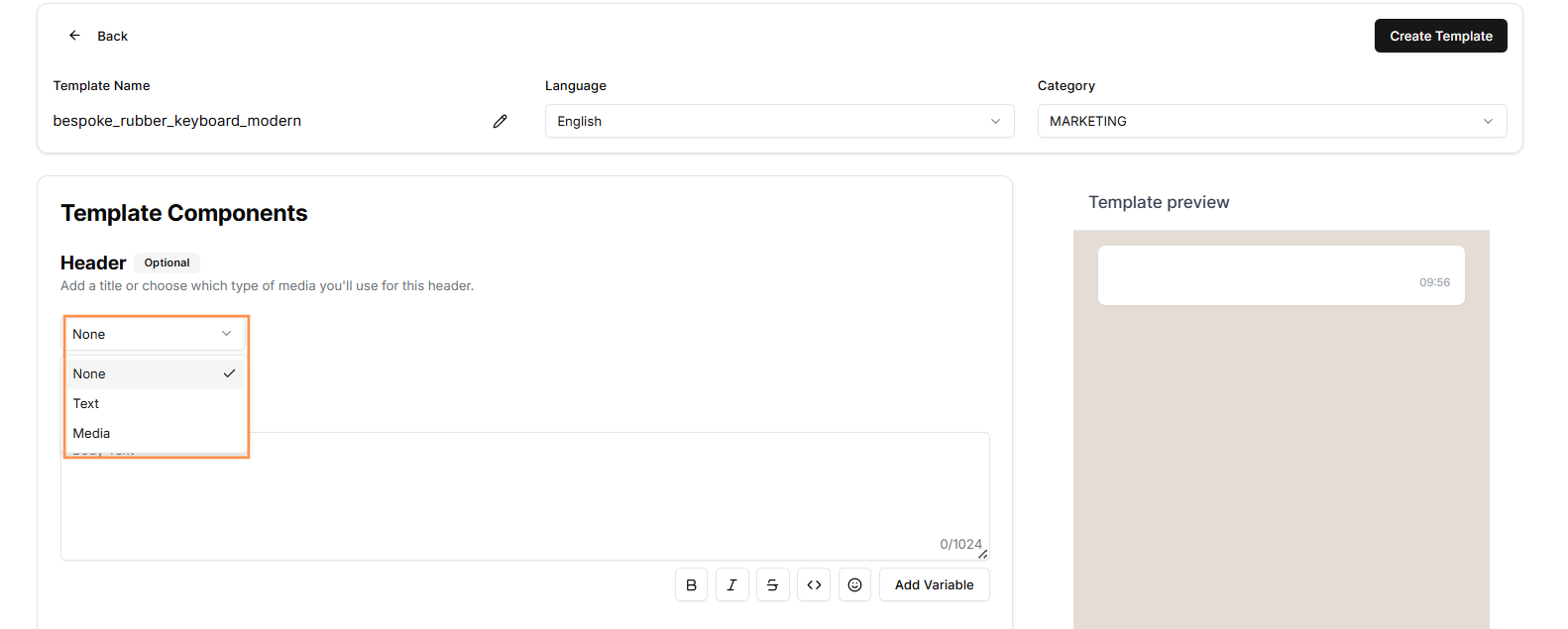 Explore diferentes componentes do WhatsApp Template