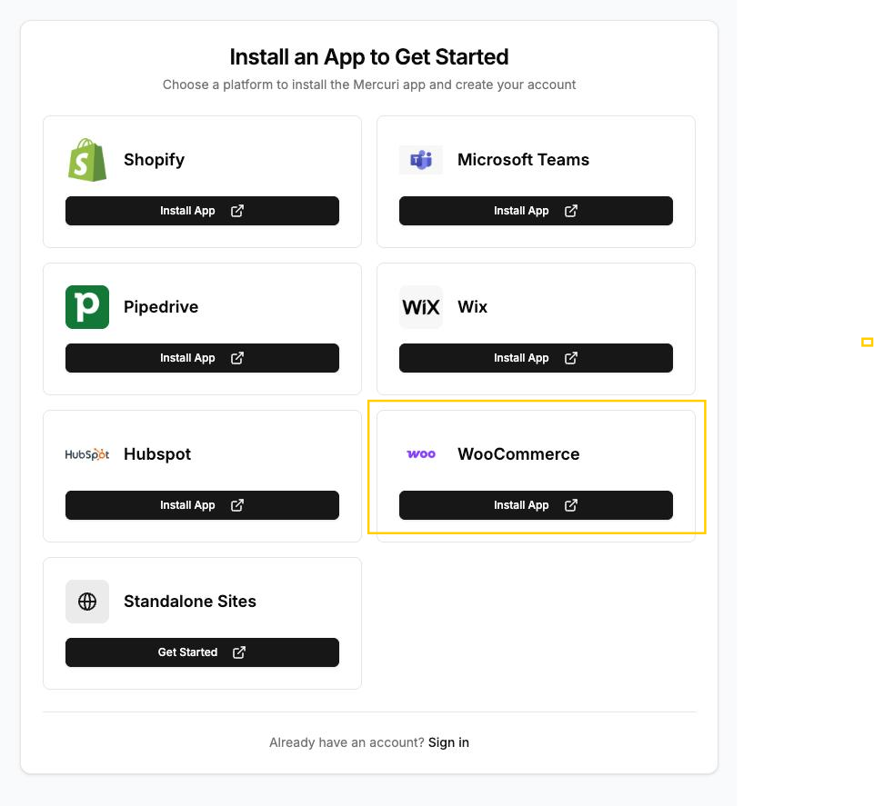 3. Na lista de plataformas, selecione **WooCommerce** para iniciar o processo de instalação.