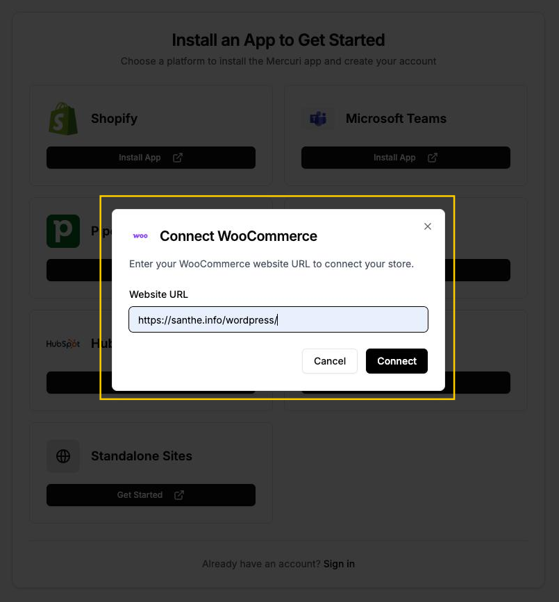 5. Após clicar em **Connect**, você será redirecionado para a tela de login do WooCommerce, onde o Mercuri solicita permissão para conectar à sua loja.